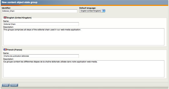 Enter the relevant information in the proposed object-state edition screen, in all applicable languages (the object states feature natively supports languages), as follows. Then click the « Create » button.