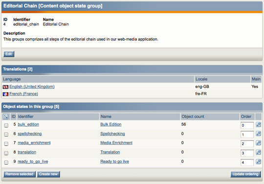 Then create the various object states, mapped to your editorial chain. In order to do so, you will need to click the «Create New» button under the «Object states in this group» block, from the object states group full view. Note that the first state in a group will be the one applied by default to objects. It should eventually look like this :