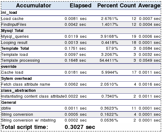 This section of the debug output displays timing information about various parts of the system, such as template processing, character set conversions, XML processing and information about SQL queries. This section also displays the results from the debug-accumulator template function.