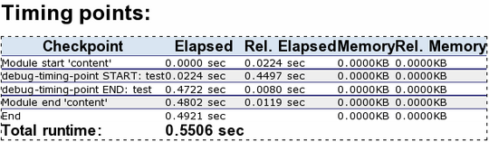 One thing to note here is that the last and second-to-last times in the timing points are usually different. The second-to-last point, labelled "End", shows the total processing time. The "Total runtime" also includes the flushing of the output buffer, which means that the content has been sent to the browser. If you have a slow connection, there will be a larger difference between these numbers.