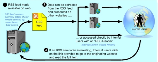 RSS (Really Simple Syndication) is an XML web standard used to distribute information about a website's content to other websites and Internet users. This involves the process shown below.