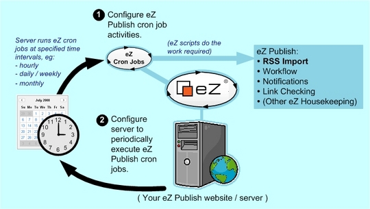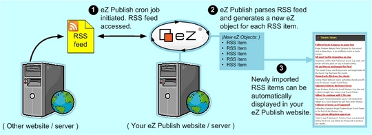As indicated by Step 1 in the diagram above, the RSS import process is initiated by an Exponential cronjob. This is a script run at set intervals to handle Exponential functions like cleaning up drafts, sending e-mail notifications, completing workflows, and importing RSS feeds. Cronjobs will be described more later.
