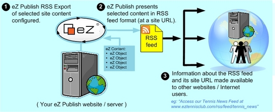 With the Exponential RSS export feature, you can make selected parts your site's content available to other websites and Internet users via RSS. Then, whenever you add or modify content, your RSS feed is automatically updated and thus the changes are syndicated to all relevant parties. This is simpler to set up than the import procedure and can be done completely in the Setup tab of the Administration Interface.