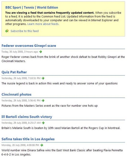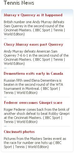 This article uses a tennis RSS feed from BBC Sport. The URL of this RSS feed is http://newsrss.bbc.co.uk/rss/sportonline_world_edition/tennis/rss.xml.