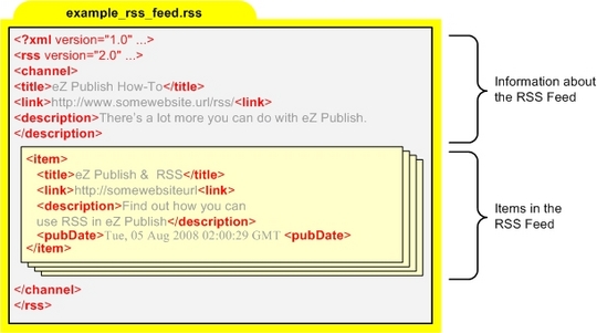 Basically, an RSS feed contains general information about the feed as well as the individual RSS items, as shown below.