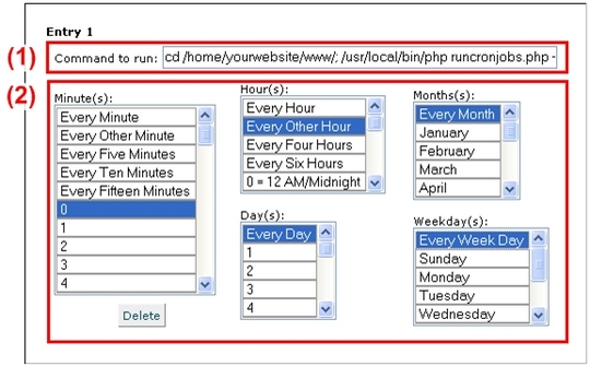 There will be one set of these entries for each cronjob that has been configured for your web hosting service. If there are any existing entries, it will probably be best to leave these and add a new one; check with an expert if you are unsure. You can also use multiple entries to run different Exponential cronjob tasks (if you have defined multiple cronjob parts) at different times.