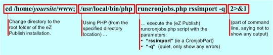 Expect this command to be slightly different for your site’s server. Translated into human terms, it says “change to the root directory of the Exponential installation, and using PHP (located at the path specified), run the runcronjobs.php script (with some parameters)”.