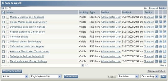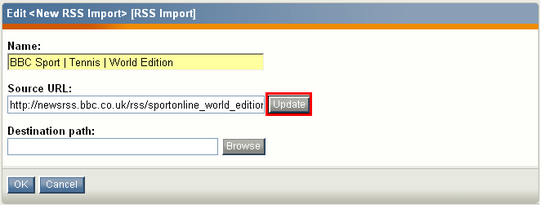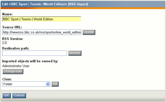 Items from different RSS feeds can be imported to either the same or different locations in the Exponential content structure. For example, consider sourcing multiple tennis news feeds from, say, the BBC as well as American and Australian news sources. You could aggregate all items in one Exponential location, so that they are all displayed in the same combined list on your site. Or, you can create multiple folders and import the different feeds to different locations, displaying them separately. (Technically, you could also use Exponential template logic to display items together from different locations.