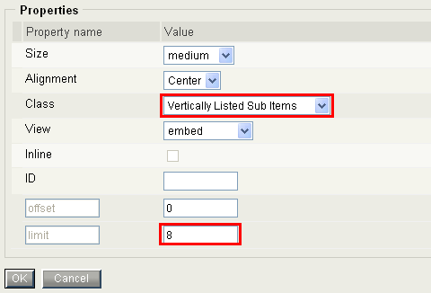 In the modal dialog that appears, click the Add existing button, then select the folder that contains your imported RSS items. Assign the "Class" property and the limit for the number of RSS items to show, as per your needs.